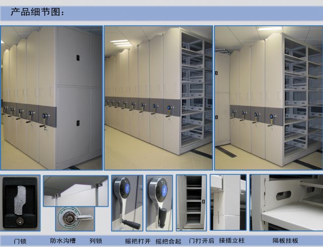 產品名稱:防水型密集柜/架產品規格:長900mm*深500mm*高2800mm產品結構: 立柱為接插型,整體高度為2800mm,防水溝槽高度100mm,7層隔板,雙面存放,層高330-340mm。板材厚度根據客戶要求,搖把自選。產品顏色:套色,基色為亞光灰本產品可以根據用戶要求定制。